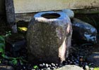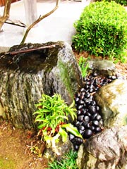 非常に珍しい形をした天然の「水掘れ石」を使用。筧を用いて水を落としつつも、つくばいのルールをあえて崩し、流しには溶岩のゴロタ石を敷き詰める事で、風流で存在感のある景となります。